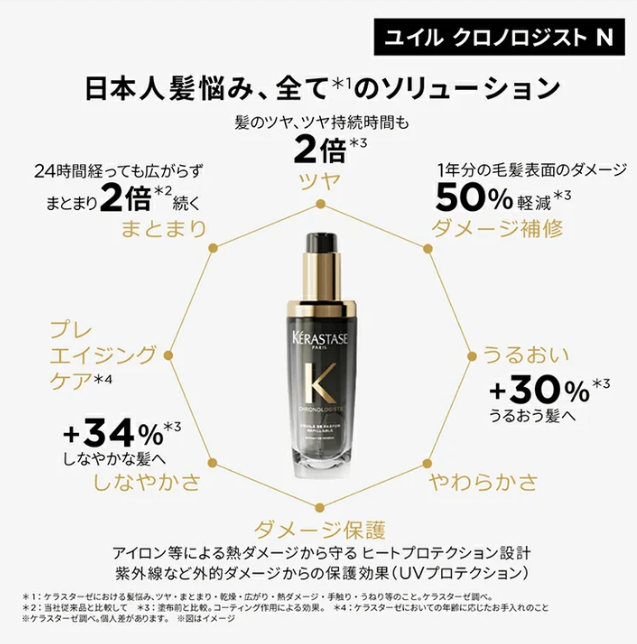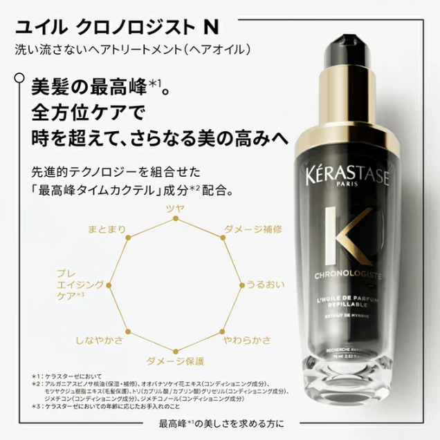 ケラスターゼ最高峰シリーズ「クロノロジスト」のヘアオイルがリニューアル登場。全方位ケアで、時を超えてさらなる美の高みへ。サラッとしたテクスチャーのオイルが髪にしっかり浸透し、しなやかでツヤのある美髪へ導きます。