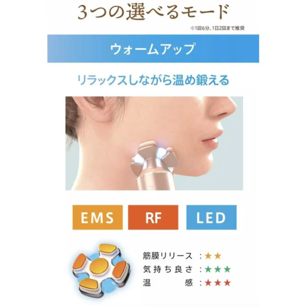 EMSとRFの同時出力で、表情筋を鍛えながら、温め、保湿をすることが可能になり、より高い効果を実感することができます。